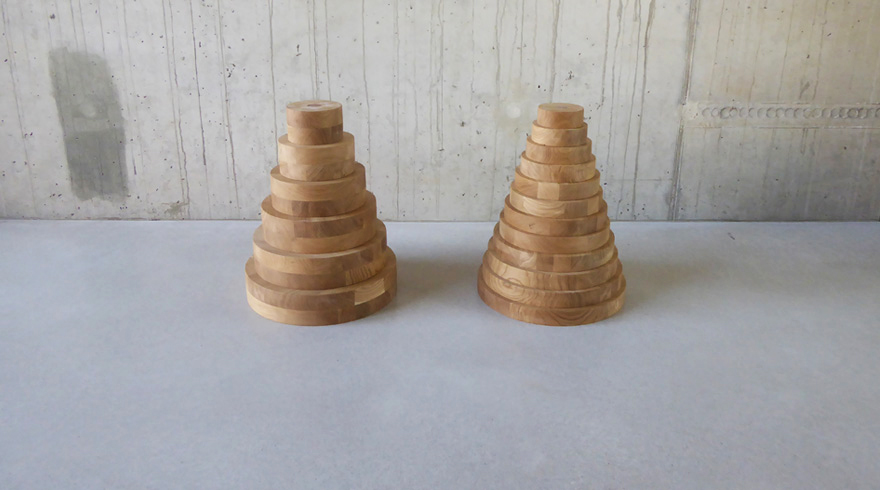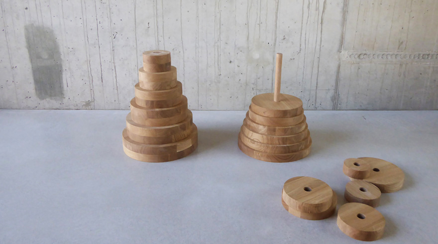 Several oak movable disks can be organized in different patterns. 120 possible configurations with version 1, 39’916’800 possible configurations in version 2.