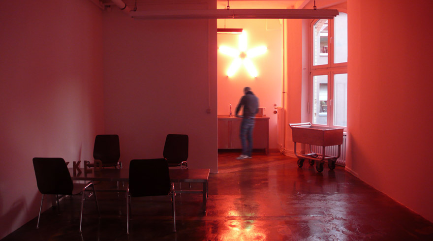 The new kitchen features industrial gastronomy equipment found in the typical Kebab restaurants in the neighborhood and a neon lit red star derived from the logo of the company. It acts as informal meeting room, separated from the open space by transparent industrial curtains.