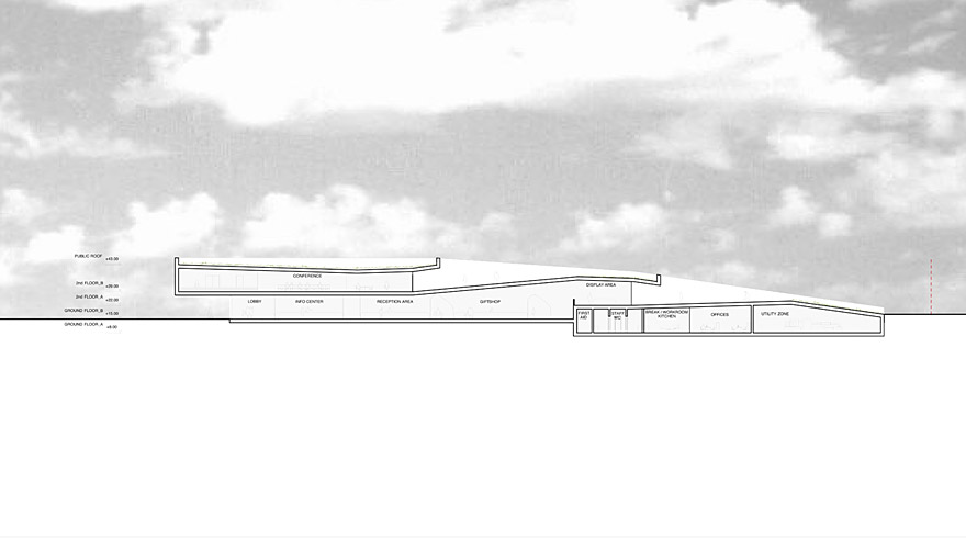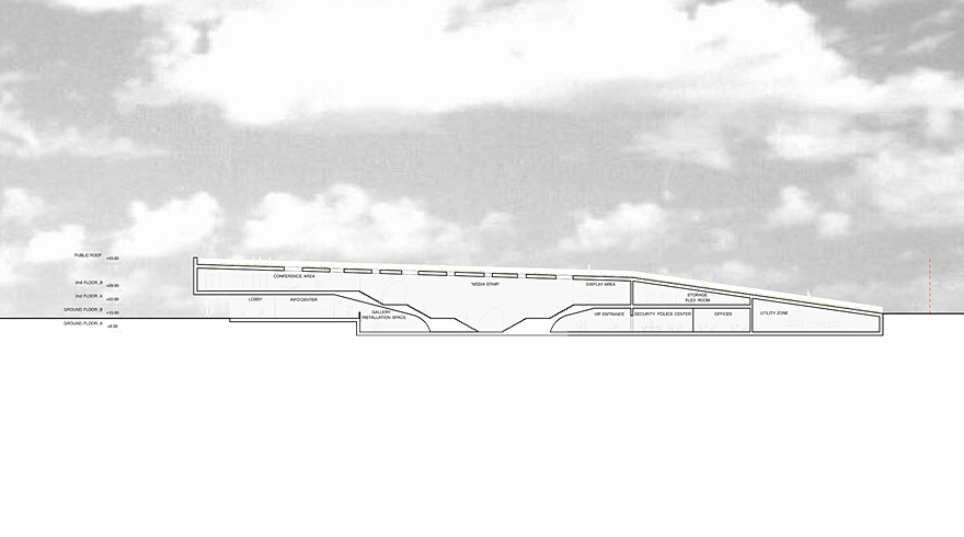 Due to existing topography, the split level organization activates both city and park level. On ground floor, shop, reception, and information center are located towards street – bar and gallery towards river. The central skylit staircase acts as flexible projection hall, fulfilling static function and leading to exhibition and conference area. These two programs are arranged inside a concrete mass floating above the transparent ground floor. Two ramps cut the roof, leading the visitors flow towards the public flow of the community park above.