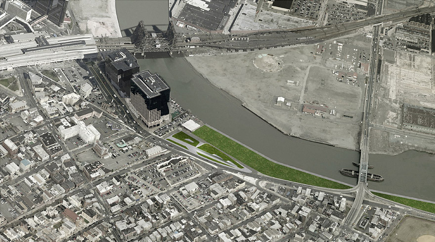 The volume arises from the surface as extension of the Passaic riverfront park from the eastern corner of the triangular site. Positioned at some distance from the NJT skyscraper, it leaves generous space for a public park, parking, drop-off and entrance area. The roof ramps up towards the Downtown urban fabric creating an accessible public landscape hosting urban programs like outdoor cinema, stages, sun bathing, playground,…